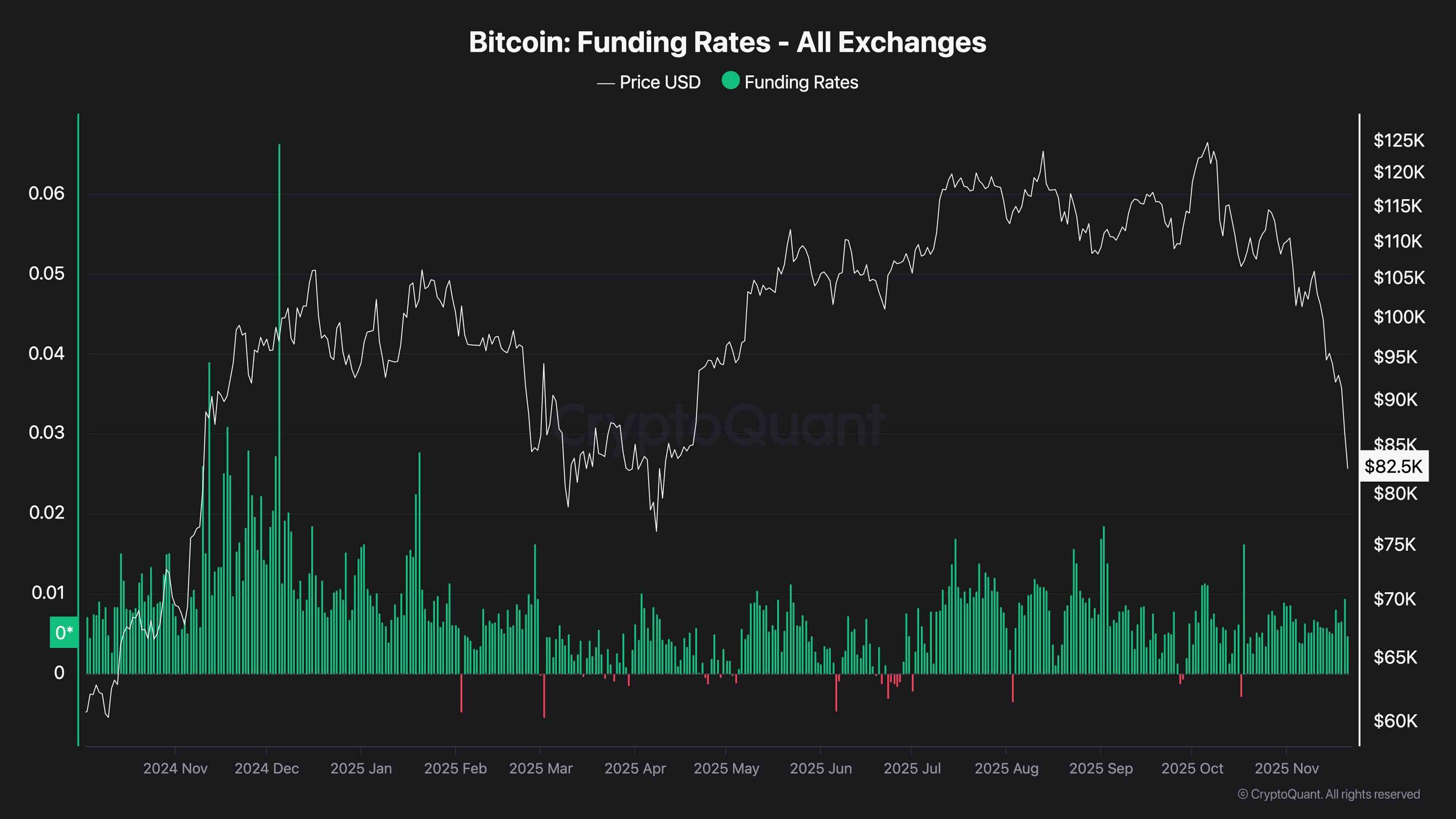 Funding rates across exchanges are still hovering in positive territory, despite the aggressive drop in price. This disconnect shows that many traders are still holding long positions, potentially waiting for a bounce.
