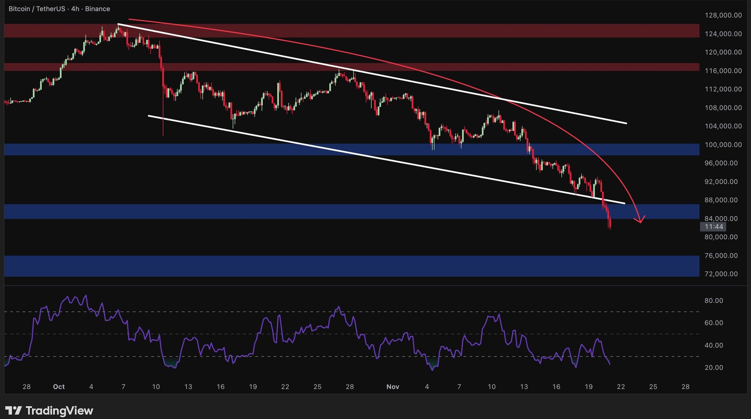 Any retest of the $85K zone may now act as resistance, as it has been broken to the downside. With the RSI hovering near 20 in oversold territory and showing multiple failed recovery attempts, short-term momentum remains clearly bearish unless a deviation back into the channel with strong volume materializes.