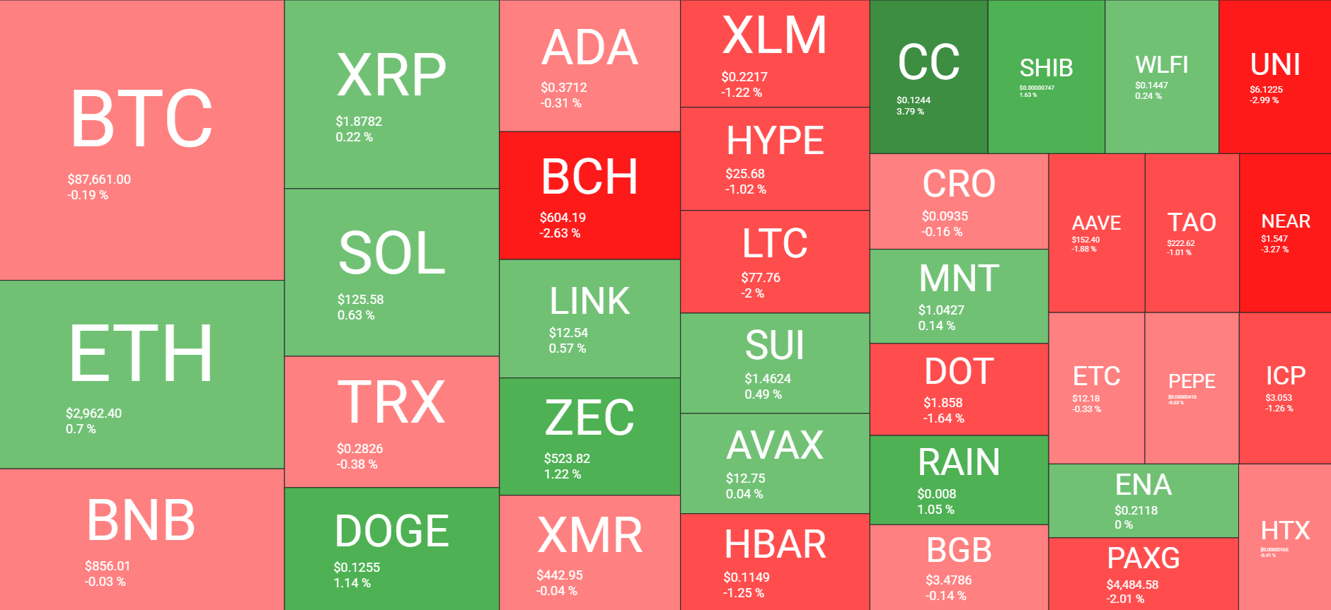 On a daily scale, SOL, ZEC, and DOGE are slightly in the green, while BCH has lost the most value from the larger-cap alts. CC is up by almost 4% to nearly $0.125.