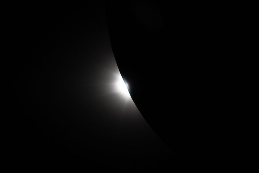 Only a portion of the Moon is visible in frame below, with its curved edge revealing a bright sliver of sunlight returning after nearly an hour of darkness.