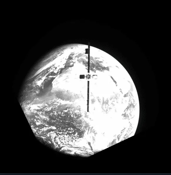 A robotic servicing vehicle captured this black-and-white image of the Intelsat 10-02 communications satellite as it moved in for docking in 2021. Credit: Space Logistics/Intelsat