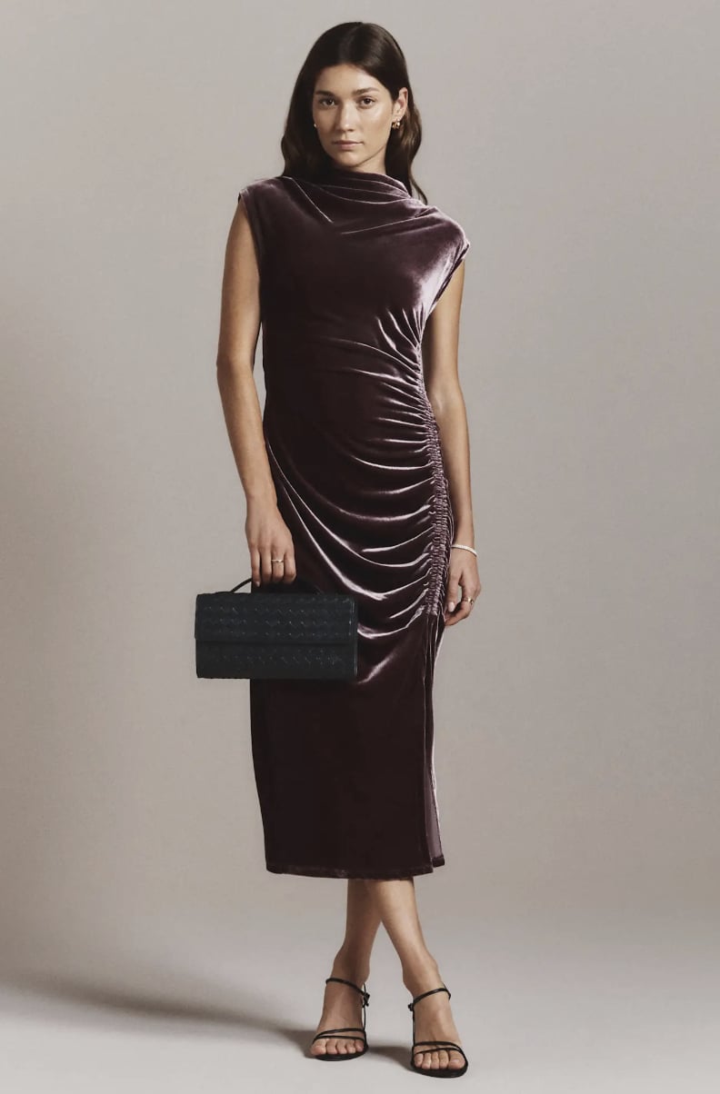 quince.comQuince Stretch Silk Velvet Ruched Midi Dress ($150)