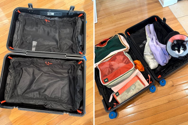 PS Photography | Sarah WasilakI'm such a fan of Cotopaxi as a brand because of the thoughtful color accents, and it was a delightful surprise to find that the suitcase interior fits the bill. The packing cubes have colorful zipper pulls and hooks that allow you to easily detach them for flexibility in packing. I personally took advantage by removing them completely, filling each side with "tougher" items I was bringing, like sneakers and hair tools, then packing the cubes with my daily outfits and clipping them back in. I found I even had extra room on top for my Popsugar Packing Cubes ($25), which I fill with smaller clothing items like socks, underwear, sports bras, swimsuits, and workout shorts. My cat Kit also tested out the luggage, and it clearly fits her perfectly — so it looks like she's coming to Disney, too.